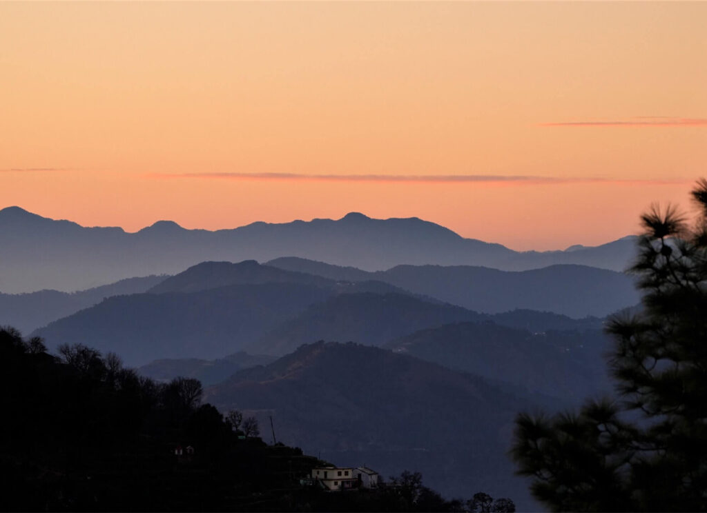 To the north, terraced farms slope down to the Kosi River, with panoramic views of Himalayan peaks like Trishul, Nanda Devi, and Panchachuli. Birdlife thrives here, drawing birdwatchers from across India. A short walk leads to the serene Devi Mandir, alive with devotion during Navratri.