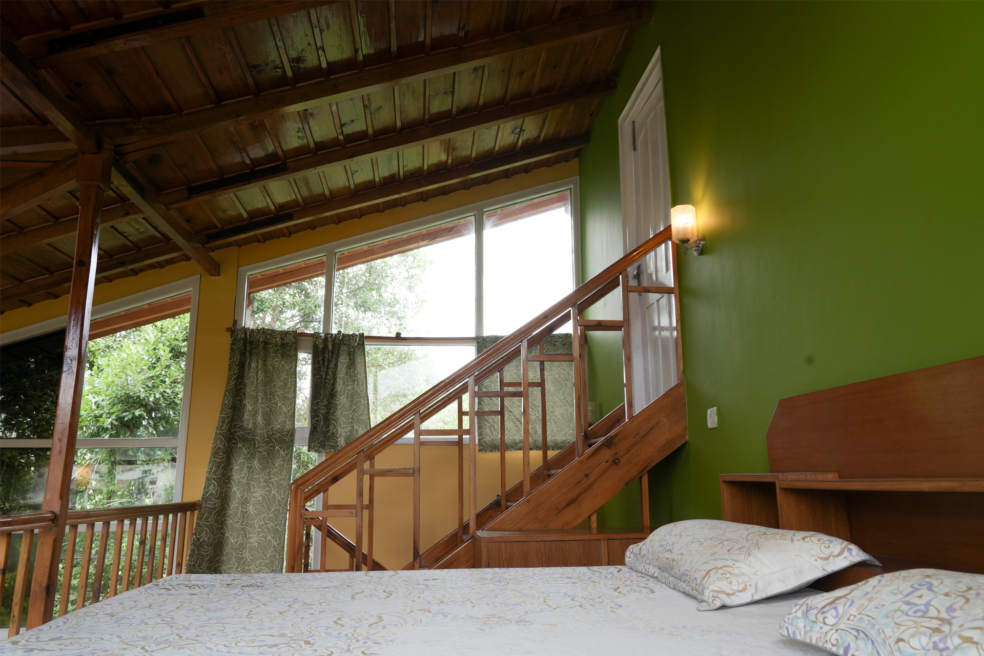 The ground floor includes a versatile study with a bunk bed for kids, a desk with bookshelf and lamp, along with sofas, divans, and a coffee table—perfect for relaxing or setting up extra bedding. A large bathroom, an additional wash basin, and floor-to-ceiling cabinets provide comfort and convenience. Guests can step directly onto a private balcony or enjoy the spacious terrace and adjoining flower garden. During monsoons, the soothing sound of a nearby brook hidden among oak trees completes the experience.