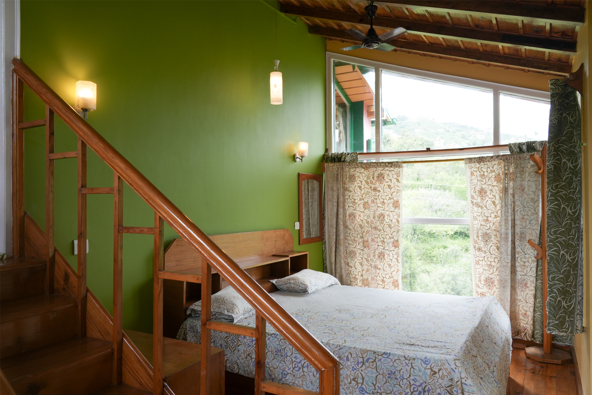 DebTaniya is a spacious two-level master suite crafted for families and long stays. The upper floor features a cozy bedroom with fitted cabinets and a northeast-facing balcony that opens to sweeping Himalayan and orchard views. A charming wooden staircase connects to the lower level, where a large glass panel brings in winter sunlight and offers sunset views straight from the bed.
